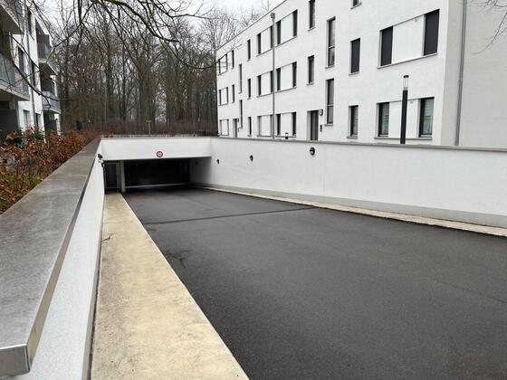 Der Stehplatz befindet sich in der Tiefgarage eines modernen Wohnkomplexes in der Nähe der Ein-/Ausfahrt der Tiefgarage.