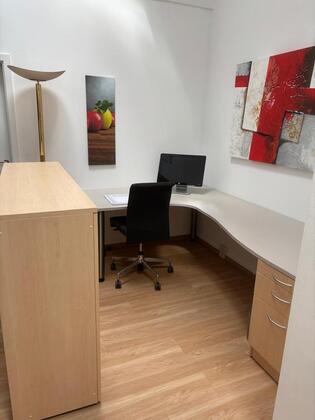 Möblierter Arbeitsplatz in Bürosuite im Obergeschoss.
